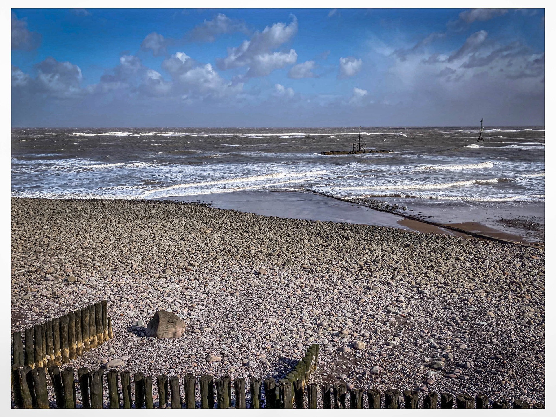Meet pebbled shores and waves between.